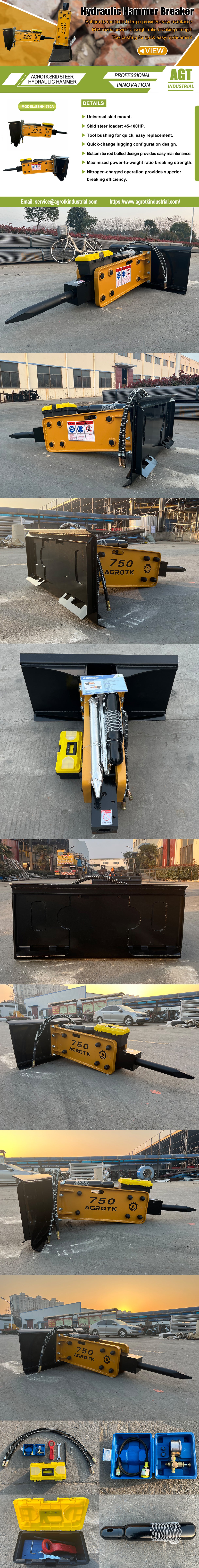 Designed for use with 45-100HP medium to large skid steer loaders, the AGT-SSHH-750A hydraulic breaker hammer gets hard jobs done with ease.